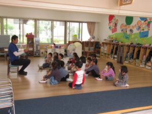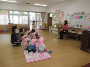 保育室に戻った後でもう一度、地震で避難する時のポイントを紙芝居で確認しました。