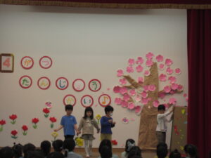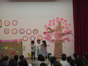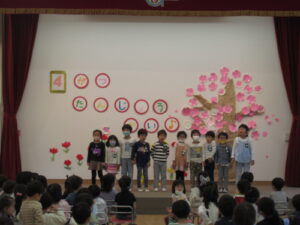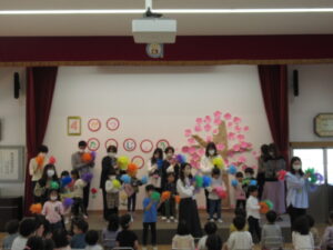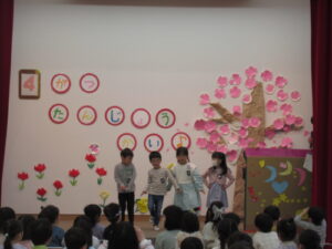 今年度も年長児が準備・運営する誕生会です。4月誕生会の名前「さくら誕生会」は年長児の相談で決まりました。そして、飾り係、プレゼント係、司会係、出し物係になって準備や練習をしました。