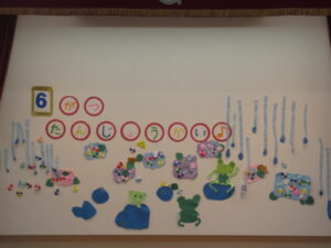 雨が降って嬉しそうなカエルと、生き生きしたあじさいに囲まれ、カエル誕生会のイメージにピッタリの飾りになっています。年長児の飾り係の力作です。