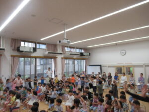 誕生児の紹介です。年少と年中は担任が一人一人紹介しました。年長児は自分で自己紹介をし、将来の夢を発表しました。