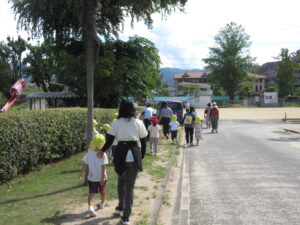 「○○が火事です、○○へ逃げましょう。」の放送を聞いて、子どもたちは、近くにいた教員や実習生と一緒に避難しました。