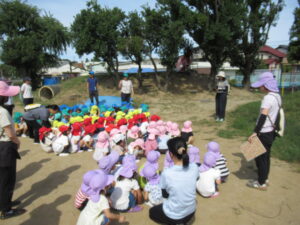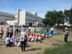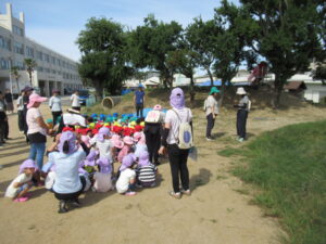 本来、避難の際には教員と一緒に速やかにその場を離れますが、今回は熱中症予防のため帽子をかぶって戸外に避難させました。