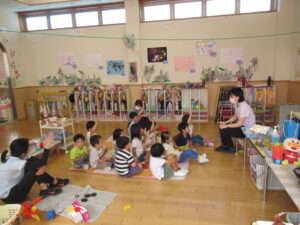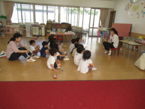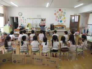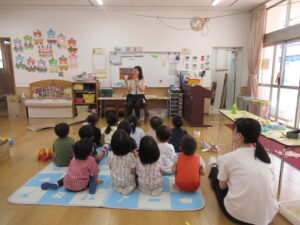 保育室に戻り、年齢に応じた紙芝居で、火災の時にとる避難行動を確認しました。