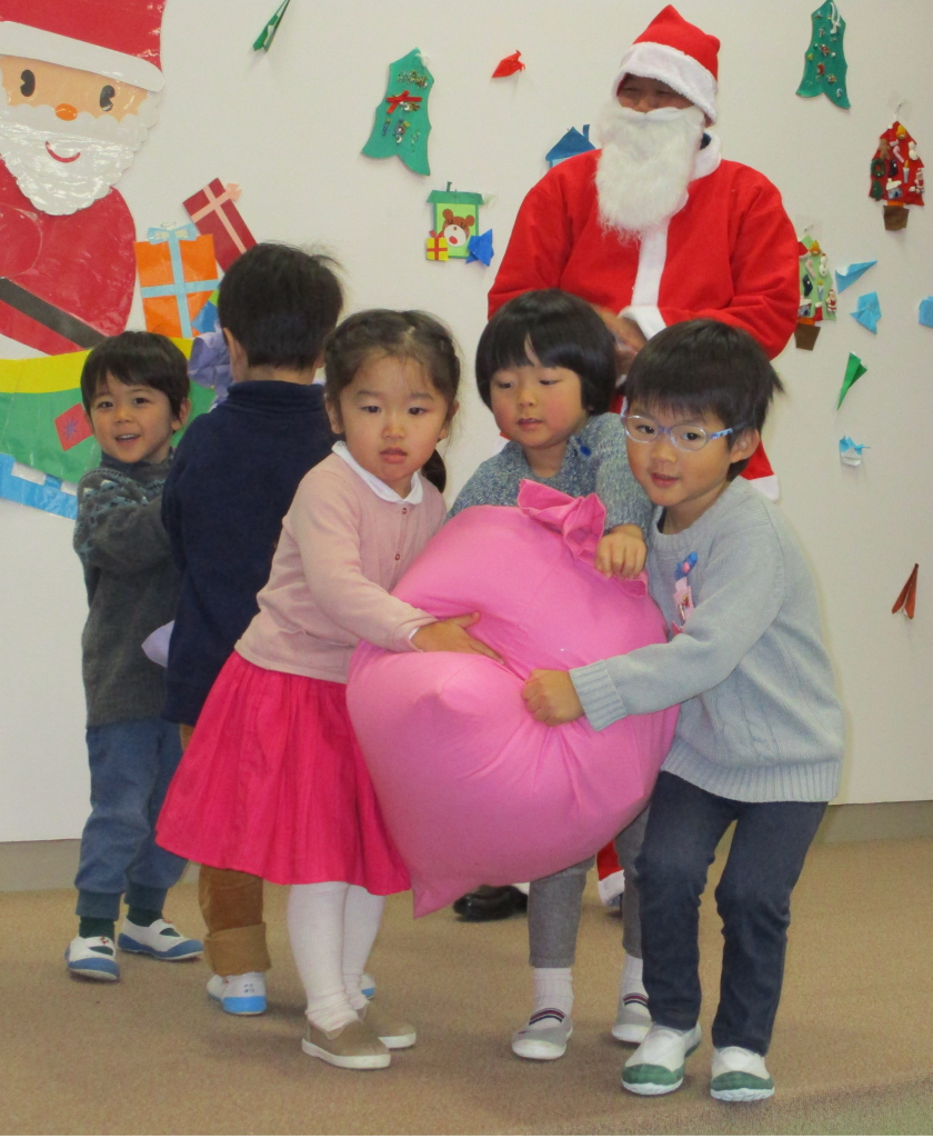 12月の誕生会がありました。年長組さんやお母さんたちの楽しい出し物の後、みんなの大好きな歌「あわてんぼうのサンタクロース」を歌っていると……何と!サンタさんが遊びに来てくれました。サンタの国からトナカイのソリに乗って来てくれたそうです。 「もっと元気に、もっと優しく、もっと友達と仲良くなるように」と、素敵なプレゼントをくれました。今日は、祝ったり祝われたりする喜びを味わうだけでなく、この季節ならではの心躍る体験ができました。サンタさん、ありがとう♪