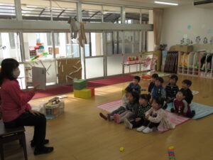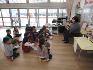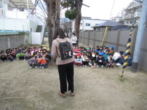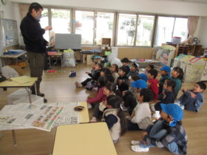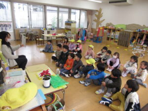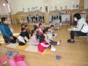 保育室に戻り、担任から話を聞きました。紙芝居を見たり、避難の約束「おかしもち」を確認したりして火災訓練について真剣に振り返っていました。