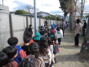 「○○が火事です、○○へ逃げましょう。」の放送を聞いて、子どもたちは、近くにいた先生と一緒に避難しました。