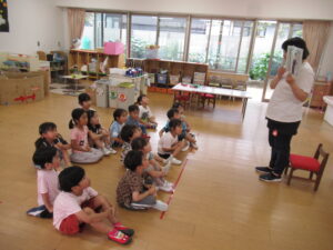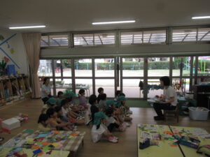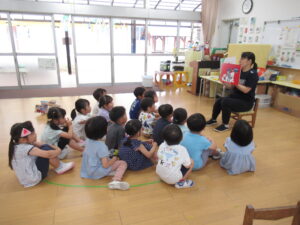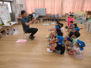 各保育室に戻った後は、担任から、異常を知らせる合図や「いかのおすし」「おかしもち」の約束について話を聞きました。また、保育中、子供だけで行ってはいけない場所の確認もしました。
