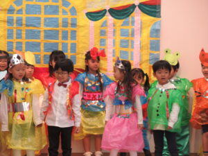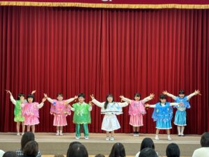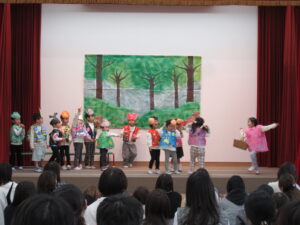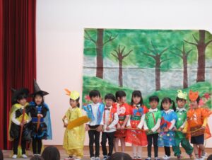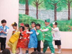 学芸会を通して、表現する楽しさや見てもらう喜び、みんなで作り上げる満足感などを味わい、子供たちの成長を感じました。明日からも、遊びの中で学芸会の余韻を楽しみ、表現活動に親しんでいきたいと思います。