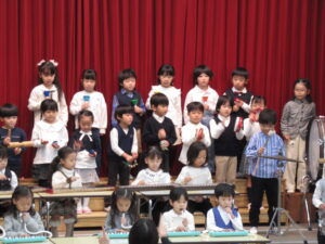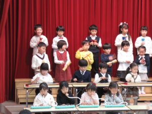 プログラム1番、年長青緑組のみんなによるベル「もろびとこぞりて」合奏「ドレミの歌」「附属幼稚園の歌」です。いろいろな楽器に挑戦した年長さん。みんなの音の重なりがすてきでしたね。最後の「ドレド!」の迫力がありましたね。