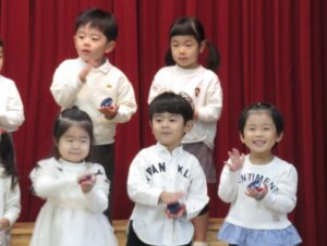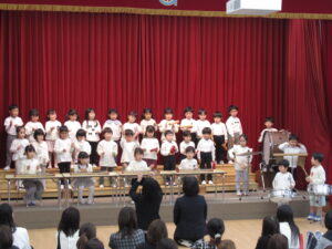 プログラム3番、年少桃組のみんなによる歌「大きな栗の木の下で」合奏「おもちゃのチャチャチャ」です。大きな身振りで歌ったり、楽しく楽器を鳴らしたりしましたね。