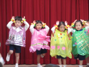 プログラム8番、年中赤黄組 踊りチームによる踊り「チグハグ、私の1番かわいいところ、ポポポポポーズ」です。笑顔で元気いっぱい踊りましたね。みんなのポーズが決まって、とてもすてきでしたね。