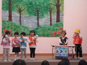 プログラム7番、年中赤黄組 劇チームによる劇「だんごどっこいしょ」です。面白いストーリーの劇でしたね。せりふを言ったり、みんなで一緒に歌を歌ったりしながら、楽しく演じましたね。