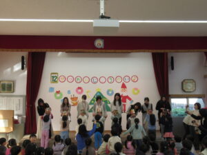 楽しい誕生会はあっという間です。最後に、年長さんからのお知らせです。今日のおやつは、クリスマスケーキです。