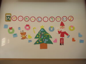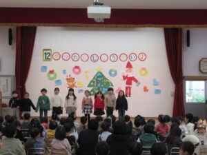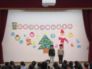 ステージの壁には、大きなプレゼントを持ったサンタさんやオーナメントがたくさん付いたクリスマスツリー、トナカイにクリスマスリースが賑やかに飾られています。飾り係さんが、がんばって作りました。みんなはサンタさんに、どんなお願い事をするのかな~🎶