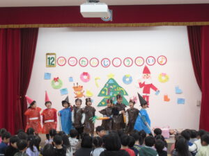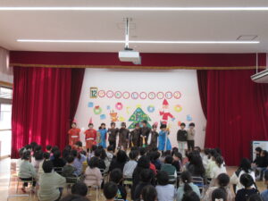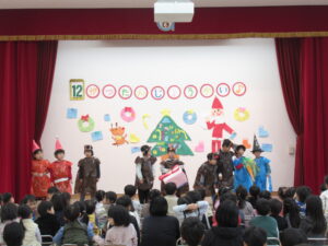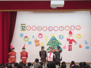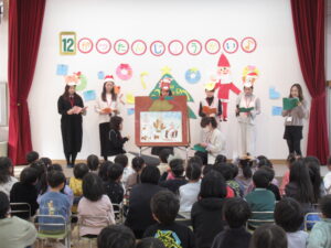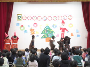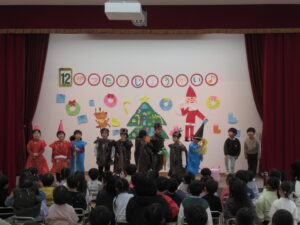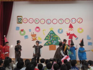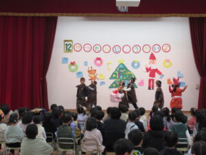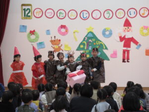 お楽しみはまだまだ続きます。まずは、年長児の出し物です。今月は、クリスマスをテーマにした劇でした。