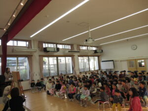 担任から12月の誕生児が紹介され、みんなで一人一人の名前を呼びます。呼ばれた誕生児は、おうちの人と一緒にステージに上がりました。動物のお医者さん、みんなの病気を治すお医者さん、電車の運転手さん、ステキな夢ですね。
