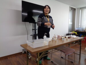 参加された保護者からは、「こんなに楽しくシンプルに小麦から絵の具や粘土を作れることを知り、絶対に我が子と一緒にやってみようと思いました。」「色の変化がおもしろかったです。子供は、きっとずっと遊ぶだろうと思います。」「今日の講座は、童心に戻って楽しませてもらいました。」「作る過程で何段階も発見があったので、さっそく冬休みに実践してみようと思います。そして子供にも自分で新たな発見をしてほしいなと思います。」などの感想が寄せられました。日ごろ子育てで多忙な皆さんが、ほっと一息つくことができる楽しい時間になりました。屋宜先生におかれましては、お忙しい中貴重なご講義をいただき大変ありがとうございました。