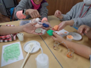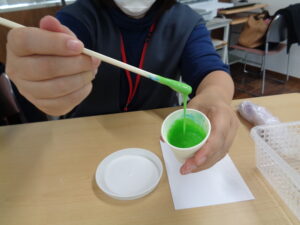 紙コップに大さじ1杯の小麦粉と水を入れて、割りばしで練ります。混ぜているうちにだんだん粘り気が出てきました。そこに、食紅を少しずつ加えて、好きな色を作りました。黄色、赤色、青色の食紅の他にも、自然の色として、ターメリックや抹茶も使えるとのこと!面白いですね。家でもやってみたい気持ちをそそられました。