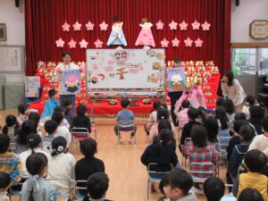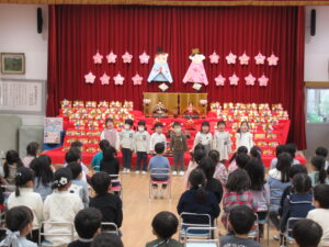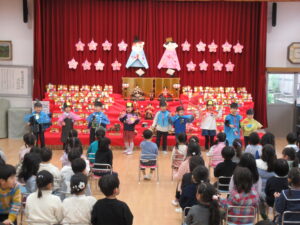 次は、年中児の出し物「踊りと歌」です。「うれしいひなまつり」に、踊りをつけて誕生児をお祝いしました。