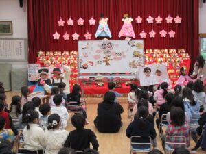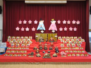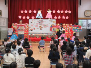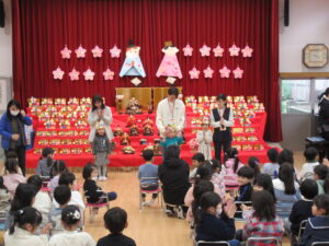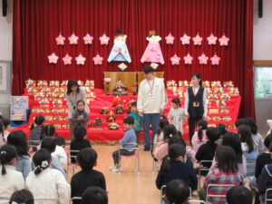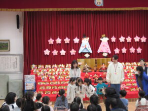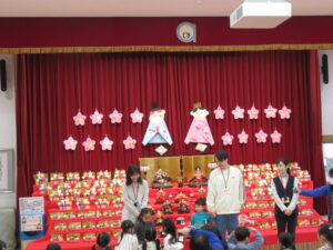 ステージには、年中飾り係の作った大きな壁面飾りと、園児みんなが作ったお雛様とお内裏様が勢揃いしています。中央には、附属幼稚園に受け継がれている、ひな人形が飾られています。