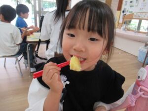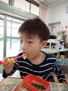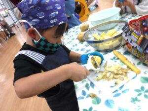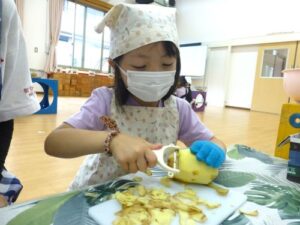 「ここは、ピーラーの耳できれいにしよう!」「手は猫の手だよ。」などと、お友達と声を掛け合いながら、安全に気を付けてピーラーで皮を剥いた後、包丁を使って一口サイズに切ることができました。