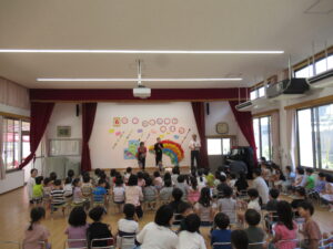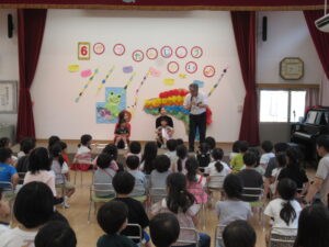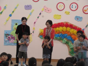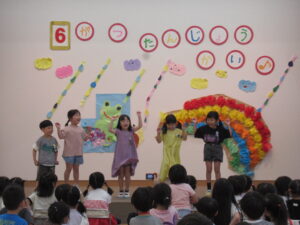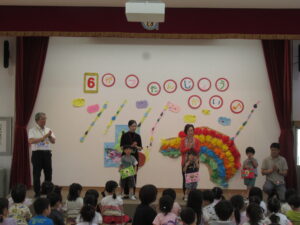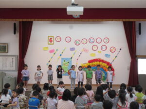 担任から6月誕生児が紹介され、みんなで一人一人の名前を呼びます。呼ばれた誕生児は、おうちの人と一緒にステージに上がりました。5月にお休みしていた誕生児も一緒にお祝いします。