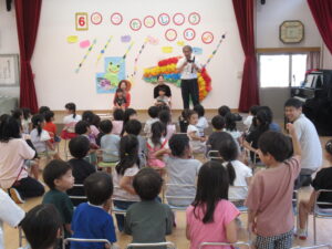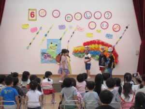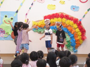 楽しい時間は、まだまだ続きます。次は、年長児の出し物「劇・盆踊り」です。