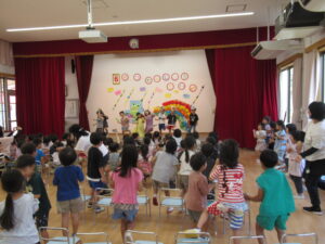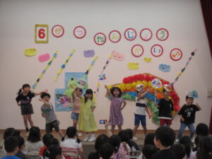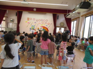 フロアにいる年長児も、ステージの出し物係と一緒に踊り、盆踊り会場さながらの盛り上がりを見せていました。