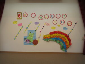 バックの真ん中に誕生児の写真、その周りに誕生児の好きな動物や好きな物、星やハートが描かれ、バックの中には、折り紙で作られたプレゼントが入っています。プレゼント係の力作です。