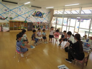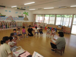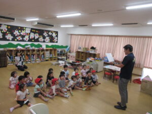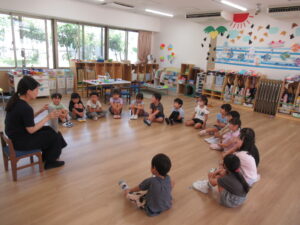 各保育室に戻った後は、担任から、異常を知らせる合図や「いかのおすし」「おかしもち」の約束について話を聞きました。