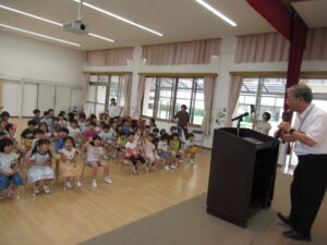 次に、園長先生の話を聞きました。途中で、園長先生がリコーダーを吹いて、「何の歌でしょう?」クイズを出してくれました。子どもたちは、よく聴いて、「チューリップ!」「こいのぼり!」「たなばたさま!」と、声に出して答えていました。さらに、1学期に学級で歌った歌を思い出しながら楽しく歌い、和やかな時間を過ごしました。