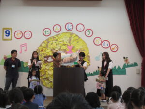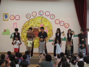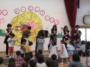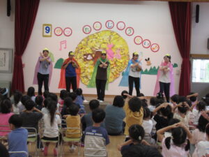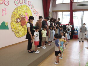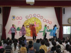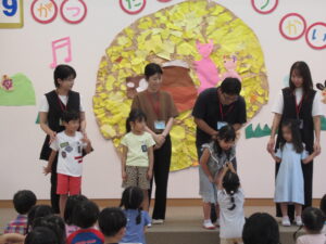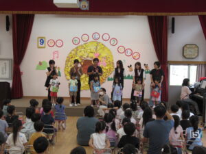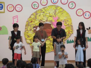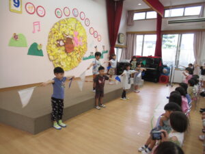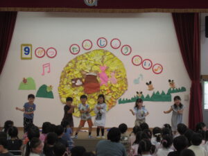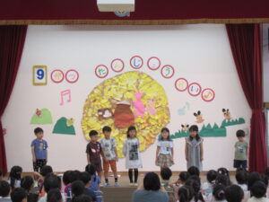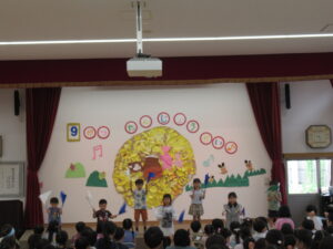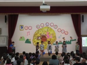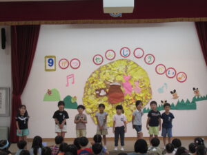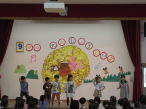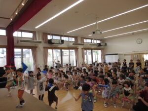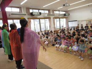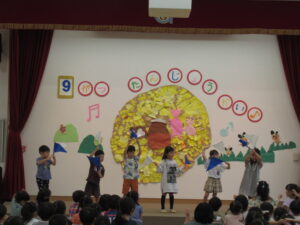 終わりに、劇担当の年長児から「みんなも覚えて、一緒に踊ろうね」と声掛けを行いました。