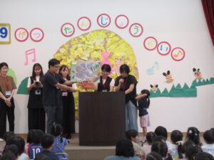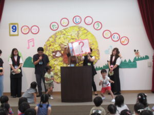おうちの人からの出し物は、動物クイズでした。誕生児たちもおうちの人を手伝ってヒントを出しました。クイズの答えは、コアラ、ハムスター、ラッコ、キリン、ホッキョクグマでした。キリンとホッキョクグマは、おうちの人が隠す場所が匠で、なかなか答えにたどり着けない場面もありました。しかし、答えられた時の子どもたちの様子は、とても嬉しそうでした。クイズに登場した動物の豆知識もおうちの人から教えてもらい、フロアからは、「へぇ~」「知らなかった」と、声が上がっていました。