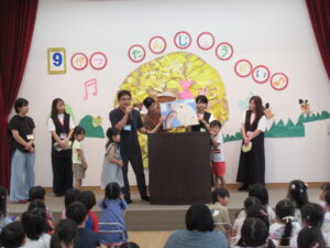 担任から9月誕生児が紹介され、みんなで一人一人の名前を呼びます。呼ばれた誕生児は、おうちの人と一緒にステージに上がりました。
