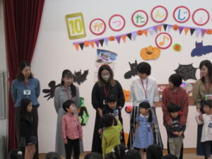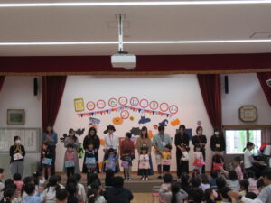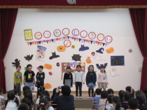 楽しい誕生会はあっという間です。最後に、年長さんからのお知らせです。今日のおやつは、ハロウィンサブレです。