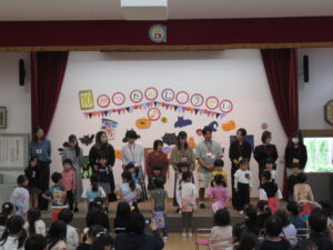 担任から10月誕生児が紹介され、みんなで一人一人の名前を呼びます。呼ばれた誕生児は、おうちの人と一緒にステージに上がりました。
