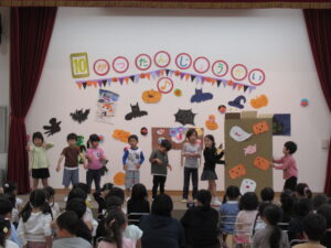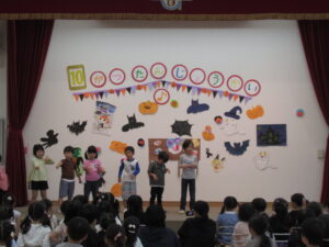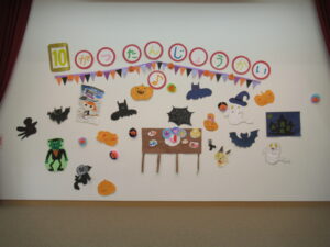 ステージには、コウモリやおばけ、フランケンシュタイン、魔女にジャックオランタン、たくさんお菓子もあります。ハロウィン誕生会にピッタリな飾りになっています。飾り係さん、渾身の飾りです。
