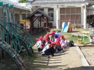 緊急地震速報の音を聞き、子どもたちは素早くカエルのポーズをとります。