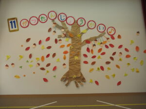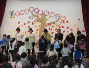 ステージには、どんぐりに木の葉やイチョウがきれいに舞って、秋の誕生会にピッタリの飾りになっています。