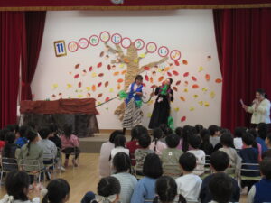 次に、保護者の方による出し物は「大きなかぶ」の劇です。おおきなかぶをおじいさんが引っ張って、おばあさんが引っ張って、それでもまだまだ抜けません。「うんとこしょ、どっこいしょ!うんとこしょ、どっこいしょ!」とフロアの子どもたちも声を合わせて応援します。犬が引っ張って、猫が引っ張って、大きなかぶはやっと抜けました。大きなかぶが抜けた瞬間、フロアからは拍手👏が!!