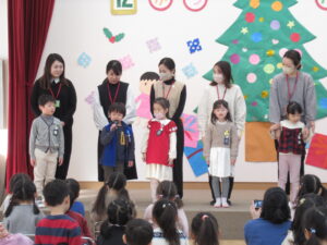 楽しい誕生会はあっという間です。最後に、年長さんからのお知らせです。今日のおやつは、クリスマスケーキです。