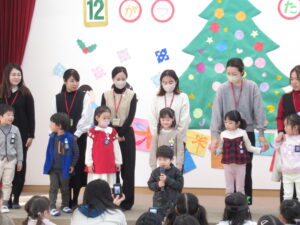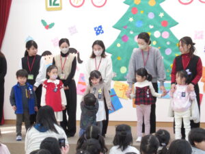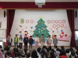 お楽しみはまだまだ続きます。まずは、年長児の出し物です。今月は、歌「あわてんぼうのサンタクロース」です。