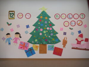 ステージの壁、中央には大きなツリー、サンタクロースがソリで降りてきて、大きなプレゼントに嬉しそうに手を繋いでいる子どもたち、雪の結晶がキラキラしています。飾り係さん、渾身の壁面となっています。