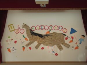 ステージの壁、中央には今年の干支である馬(午)が大きく躍動しています。馬が大好きなにんじんに、1月にピッタリの雪だるまと椿の花、楽しそうに凧揚げをしている子どももいます。飾り係さんの大作です。