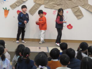 お楽しみはまだまだ続きます。年長児の出し物「得意技ショー」です。