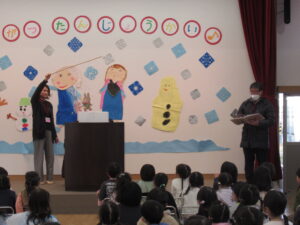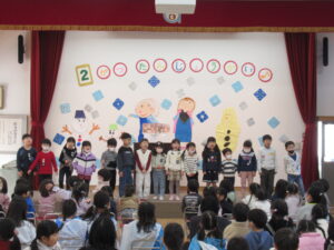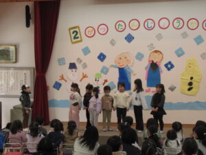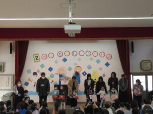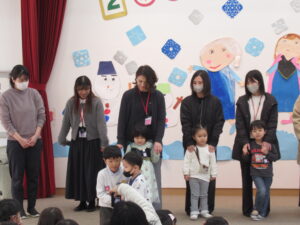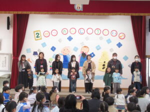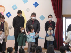 担任から2月誕生児が紹介され、みんなで一人一人の名前を呼びます。呼ばれた誕生児は、おうちの人と一緒にステージに上がりました。
