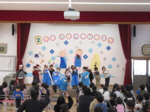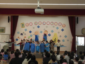 楽しい時間は、まだまだ続きます。次は、年中・年長混合出し物係による「げき、うた」です。