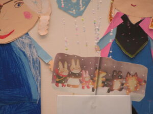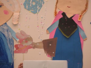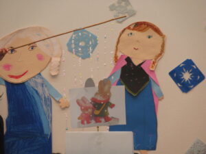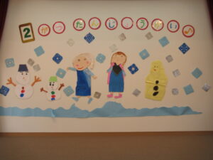 飾り係が作った壁面飾りのおかげで、雪の結晶、雪だるま、アナとエルサ、オラフもいてステキな雪の世界が誕生しています。