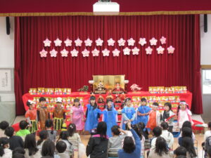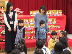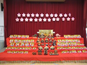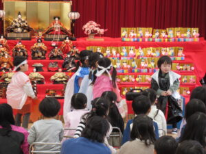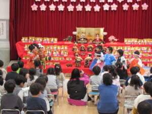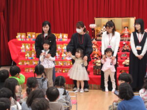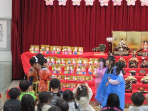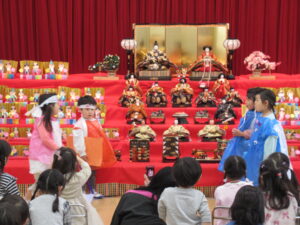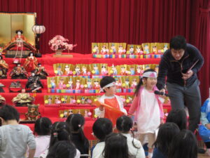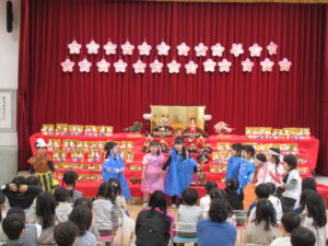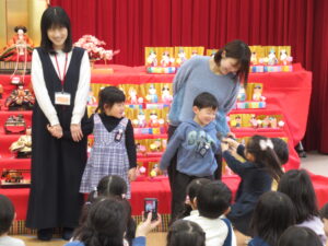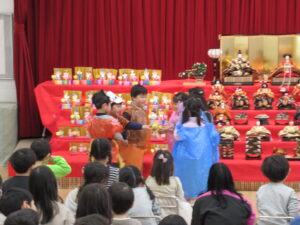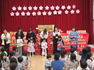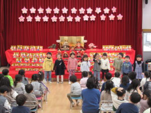 ステージには、園児みんなが作ったお雛様とお内裏様が勢揃いしています。中央には、附属幼稚園に受け継がれている、ひな人形が飾られています。後方や側面には、年中児が作った花飾りが、ふわふわ揺れています。