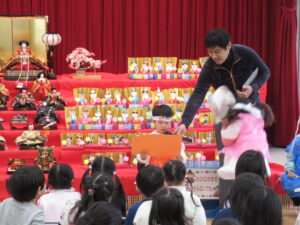 桃の節句の由来や花、食べ物に関するクイズを出してもらいました。答える側の幼児は、自分なりに考えたり、聞いたことがあったりする答えに手を挙げて解答しました。クイズの答えが正解だった際の「やった~。」が、特大になっていました。